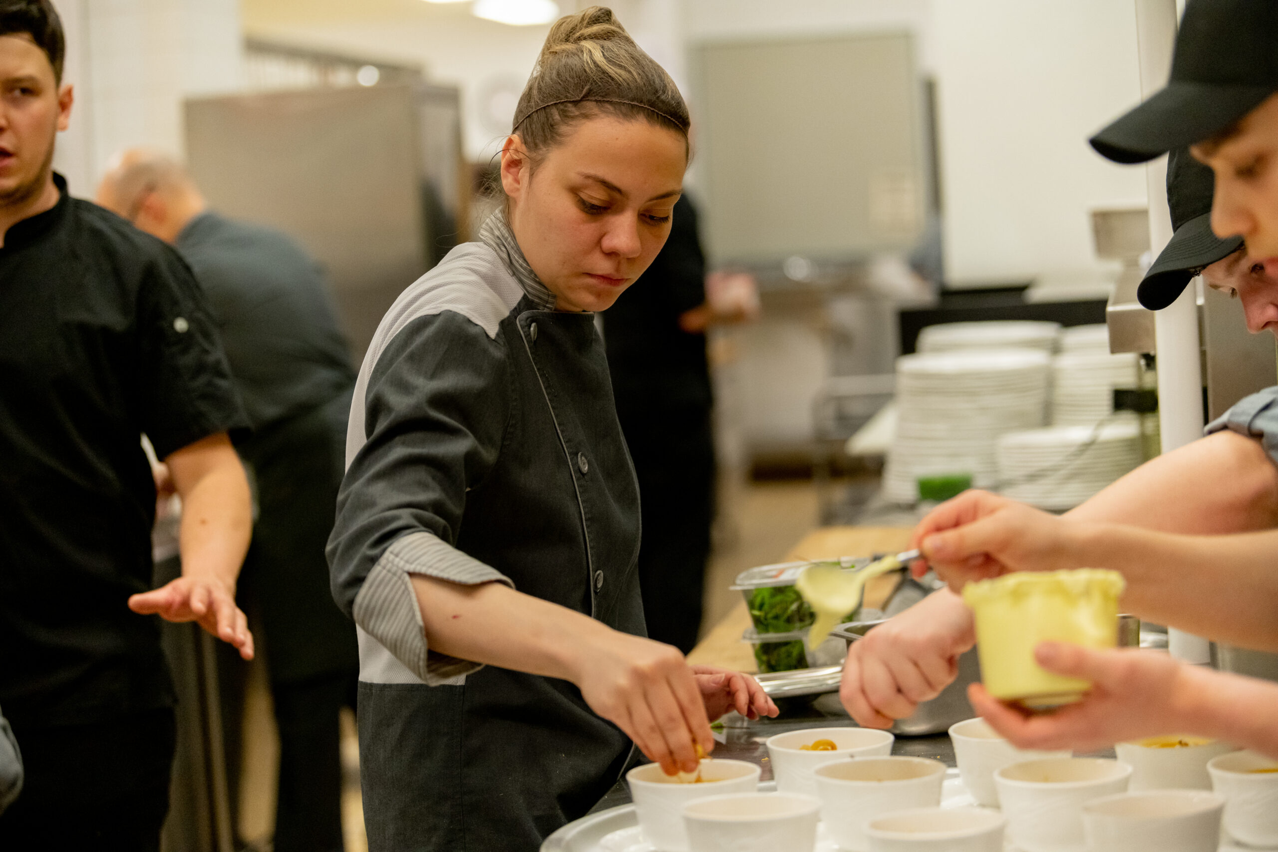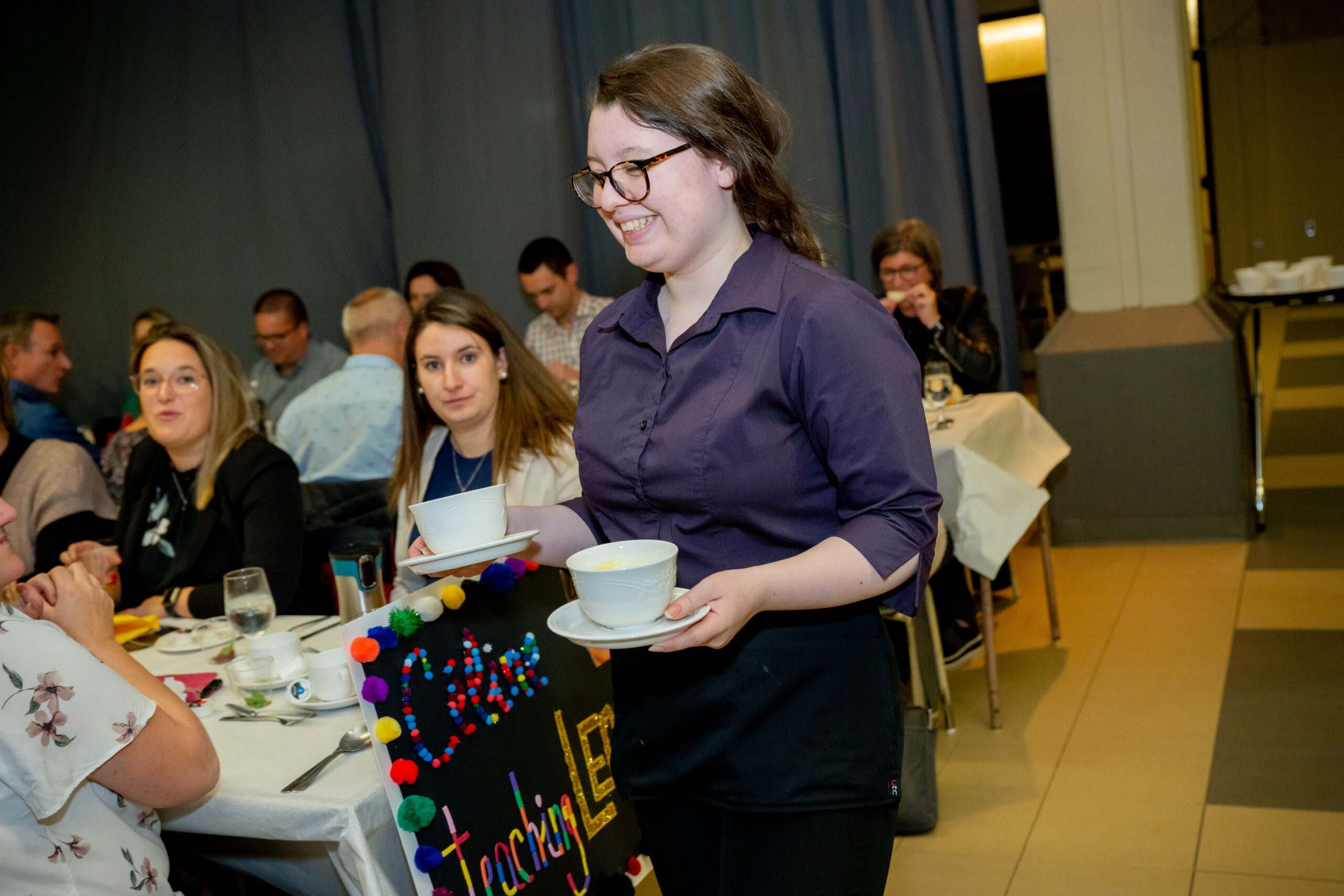 Cet événement était également l’occasion de mettre en valeur les élèves de la Cuisine et du Service de la restauration du CFP de l’Envolée puisqu’avec l’aide de leurs enseignants, ils ont tout mis en place pour assurer le succès du repas. C’est un excellent repas trois services que nos convives ont eu l’occasion de déguster. En entrée, un délicieux potage de patate douce et épices surmonté d’une garniture croquante et de crème de coco salée a été servi. Le veau était à l’honneur au plat principal, servi à l’inspiration italienne, accompagné de champignons sautés, arancini, ratatouille et purée de patates douces. Le dessert réservait encore de belles surprises puisque le gâteau aux pommes et son coulis de sucre à la crème étaient tout aussi divins que le reste du repas.