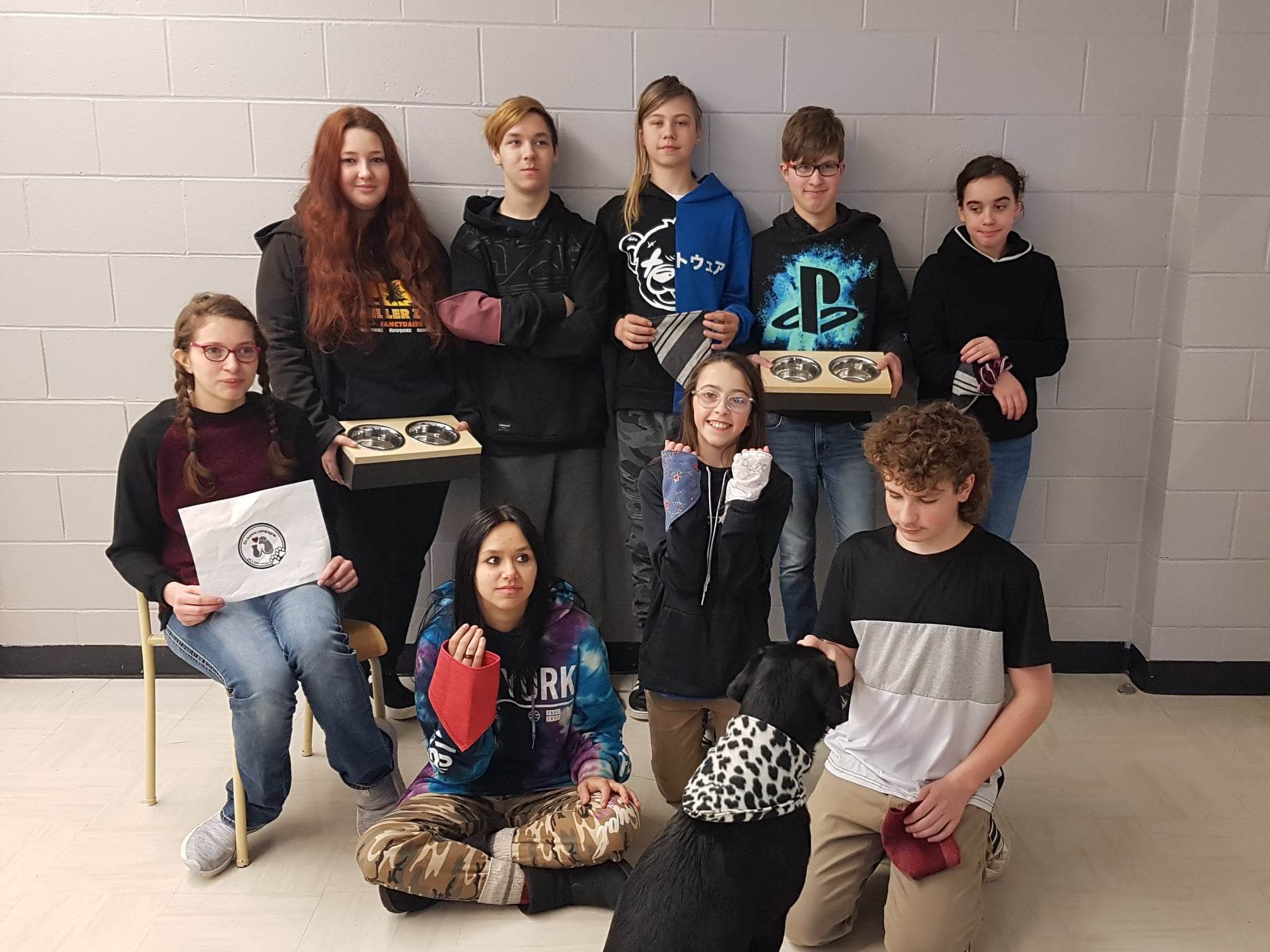 Description : Inspirés par des activités de zoothérapie reçues en classe, nous avons imaginé un projet pour redonner du bien-être aux animaux de compagnie qui nous font grandement du bien. Nos produits «En bonne compagnie» consistent en des foulards en tissu récupéré, des biscuits avec des ingrédients frais et des supports de bols à nourriture.