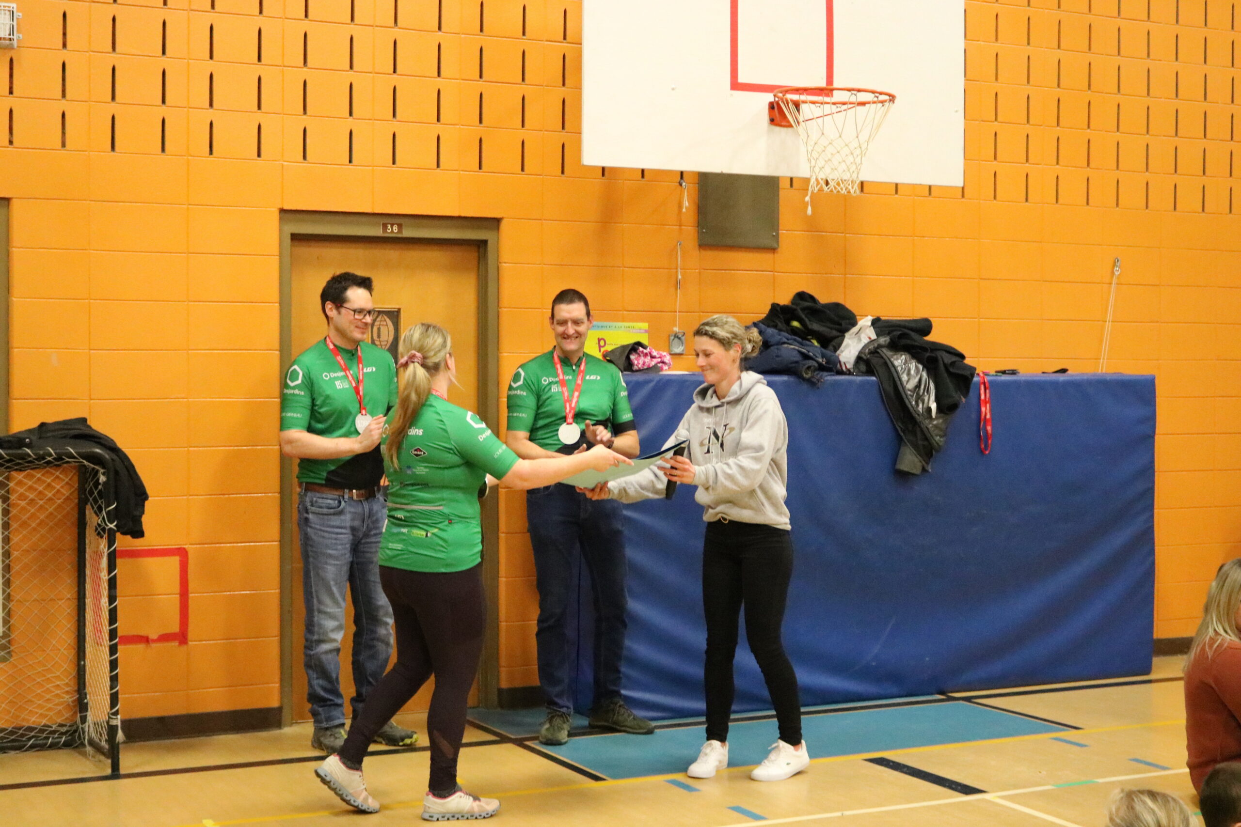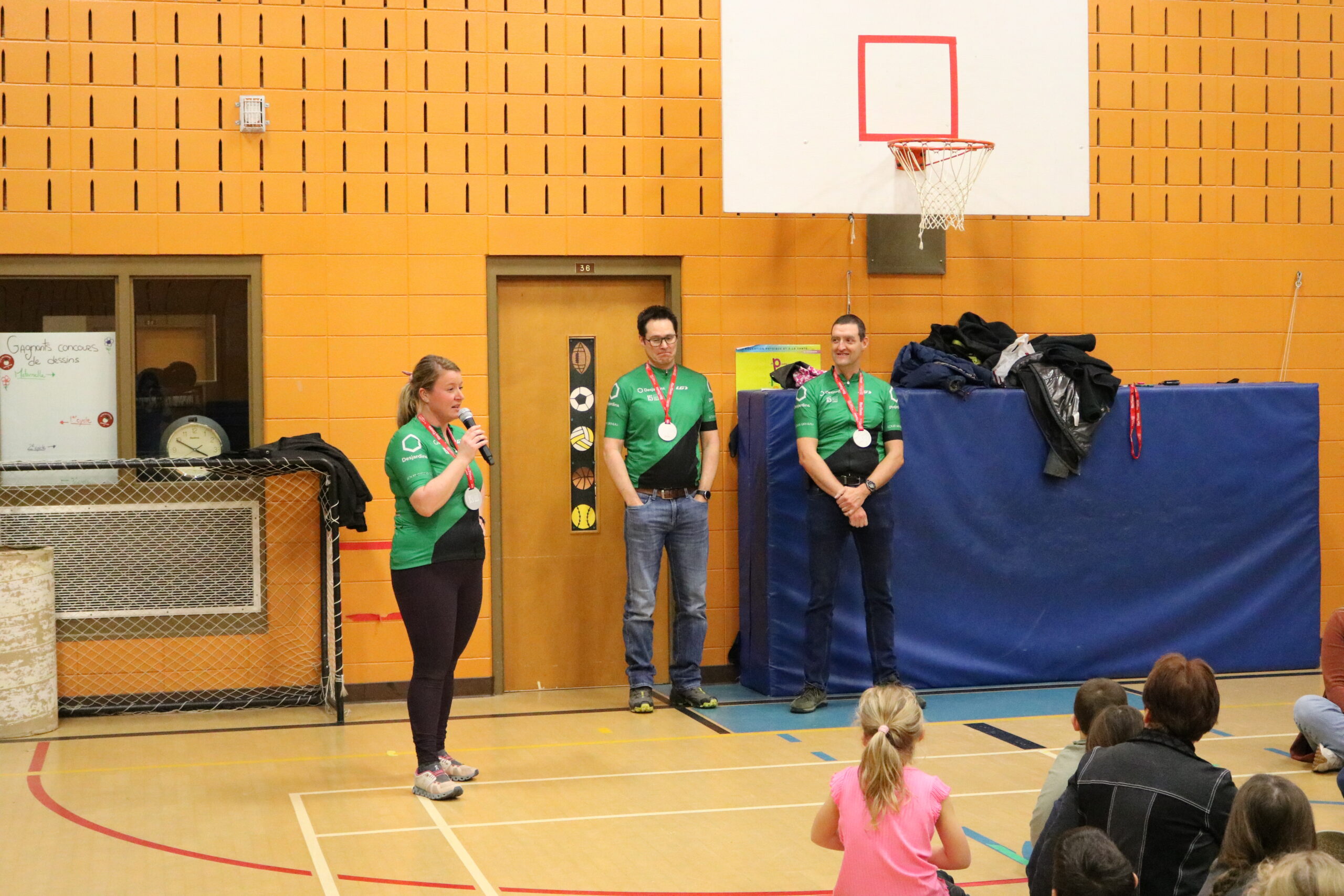 Accompagnée de deux autres membres de l’équipe « Desjardins – Technologie de l’information », Gabrielle Roy était de passage à l’école primaire de la Francolière afin de remettre le montant de 12 970 $ recueilli par elle et son équipe dans le cadre de l’édition 2023 du 1000 km du Grand défi Pierre Lavoie. Le don en argent est également accompagné d’un cadeau de 30 d’ordinateurs et de tablettes pour l’école.