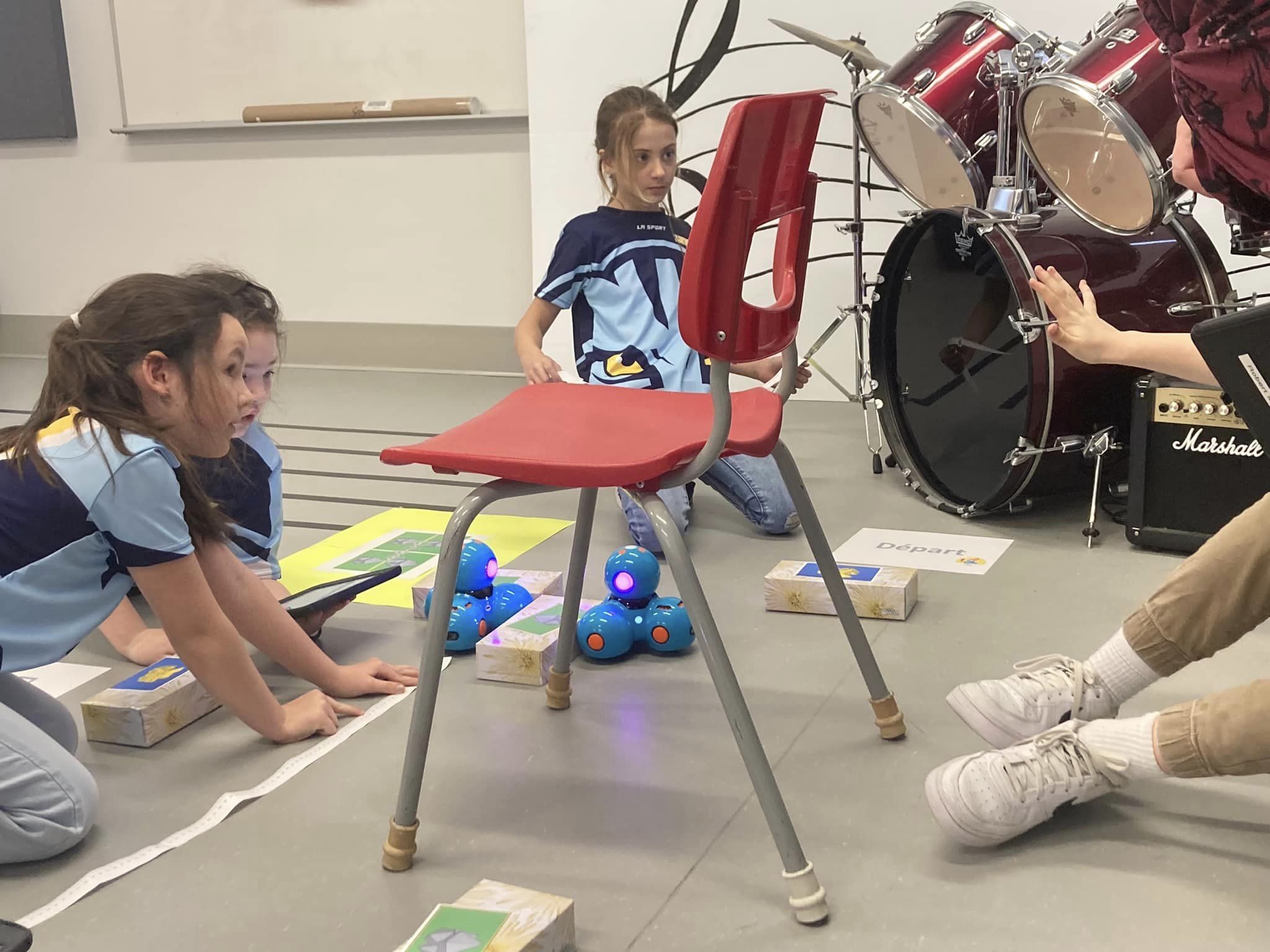 Pour terminer, les robots (et les élèves!) devaient travailler en équipe afin de récupérer un anneau et déplacer des boîtes dans une direction donnée afin que le robot qui avait la charge de récupérer l’anneau puisse se rendre sous une chaise. L’enjeu ici était d’exécuter l’action rapidement en s’assurant que les différents robots en action n’entrent pas en collision au moment de réaliser les étapes.