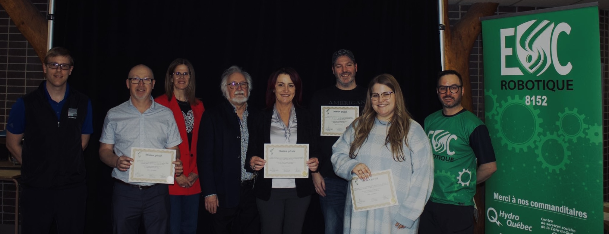 Les élèves, les mentors et les coachs de l’Escouade ont pu remercier sincèrement tous les partenaires impliqués, sans qui le projet et la participation à différentes compétitions ne pourraient pas avoir lieu. Leur contribution a permis à l’équipe d’explorer de nouvelles possibilités et d’atteindre de nouveaux sommets. Ces partenaires sont le Centre de services scolaire de la Côte-du-Sud, la Fondation de l’école secondaire de Saint-Charles, PMB, Frontmatec, Béton Mercier, Dracon, Beau-Site Excavation, Le Groupe Neurones ainsi que Rousseau métal.