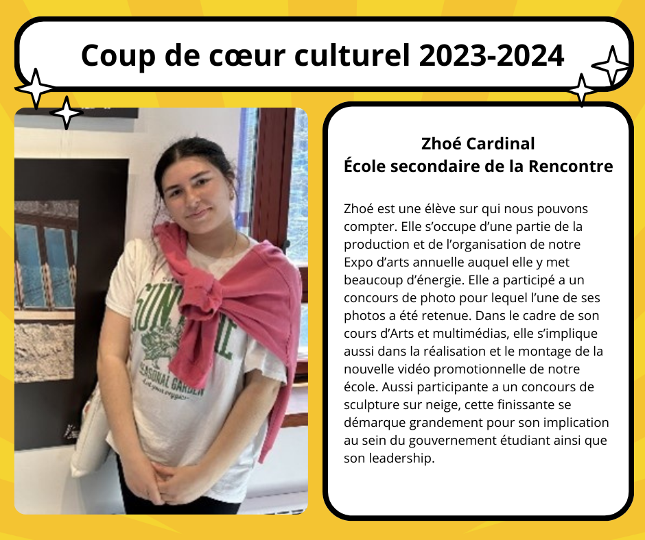 Cette année, le Comité culturel du centre de services scolaire a remis le Prix coup de cœur culturel à plusieurs élèves de nos écoles secondaires s’étant démarqués sur le plan culturel et/ou scientifique.