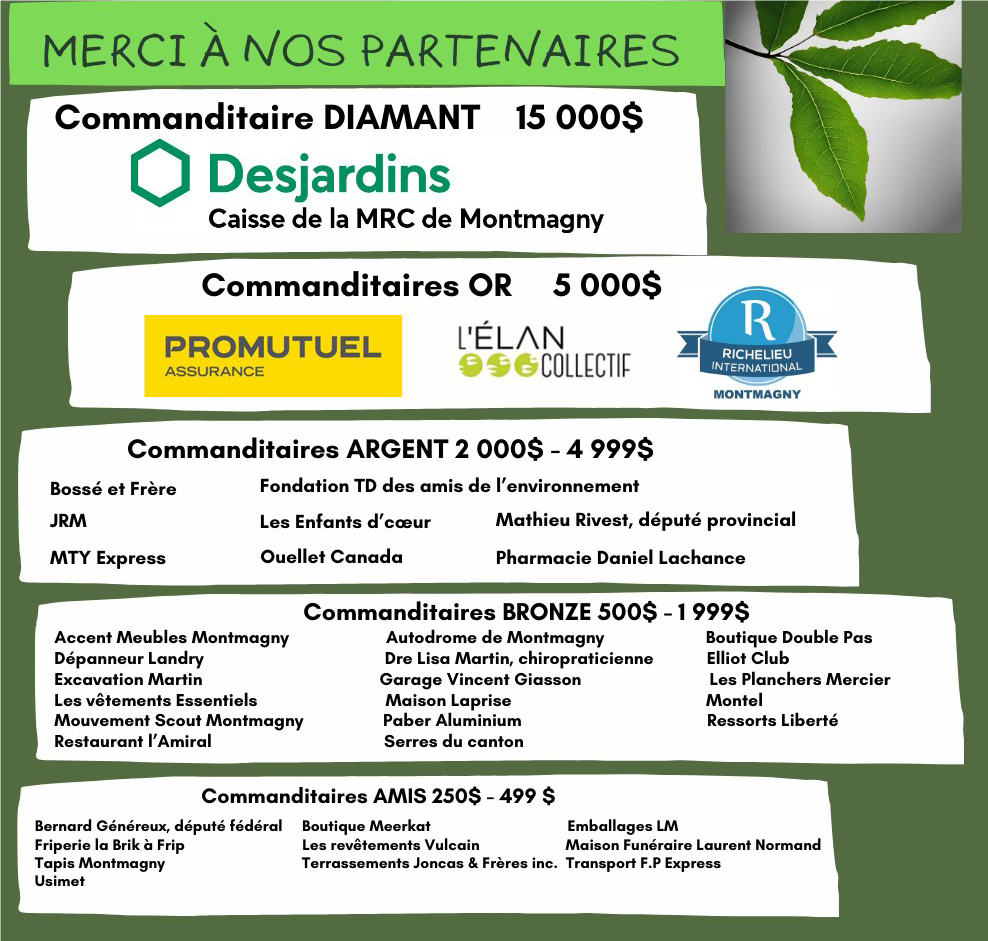 Promutuel Assurances, L’Élan Collectif et la Fondation Richelieu ont également contribué à la hauteur de 5000 $ chacun. De nombreux autres partenaires ont également offert des montants variants entre 250 $ et 4999 $ faisant ainsi une énorme différence dans la revitalisation de la cour.