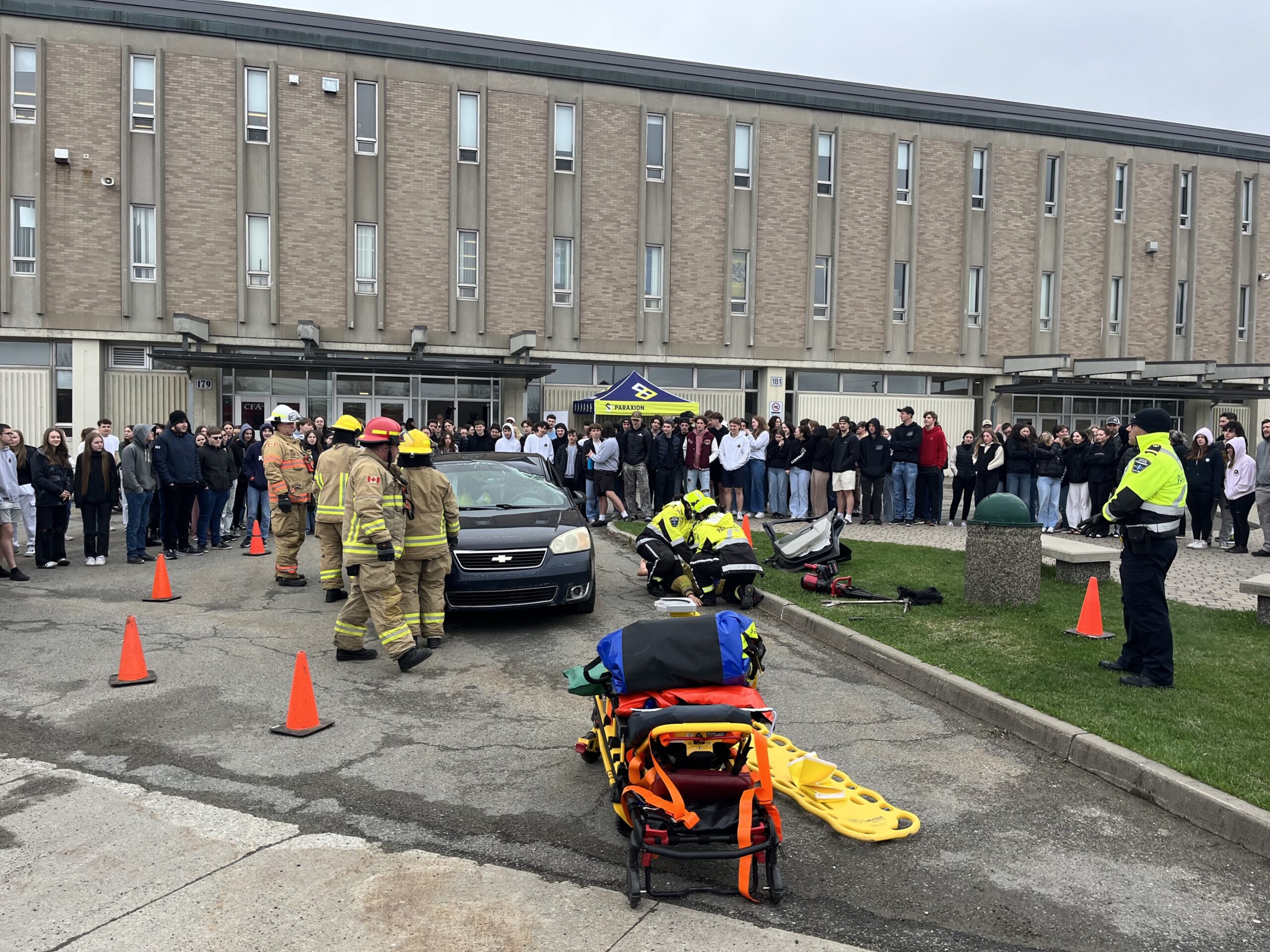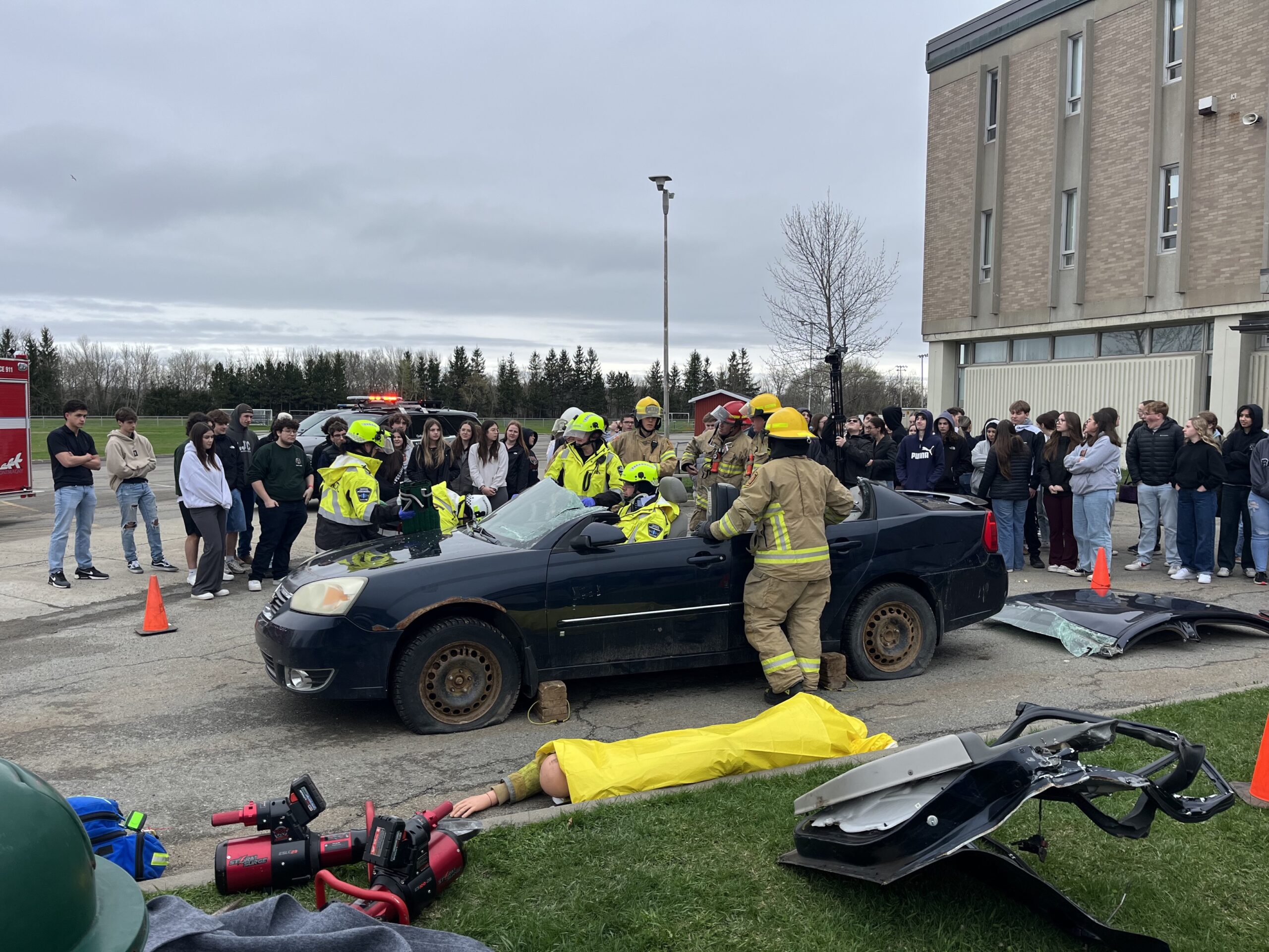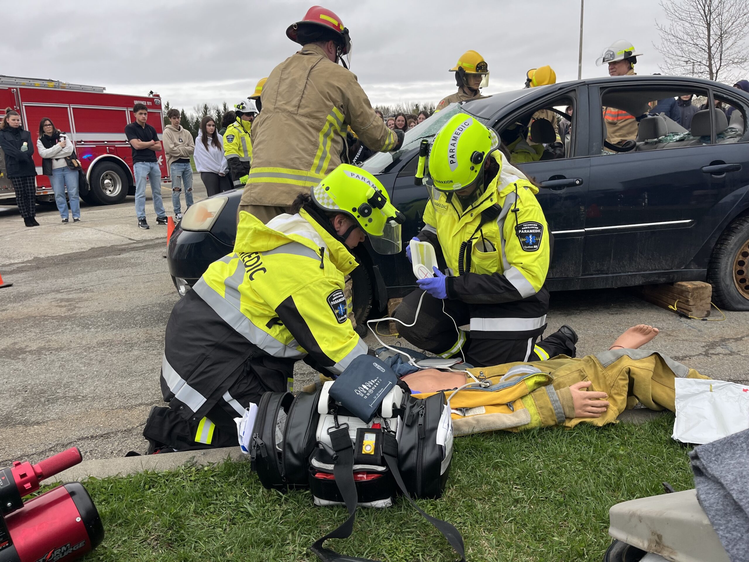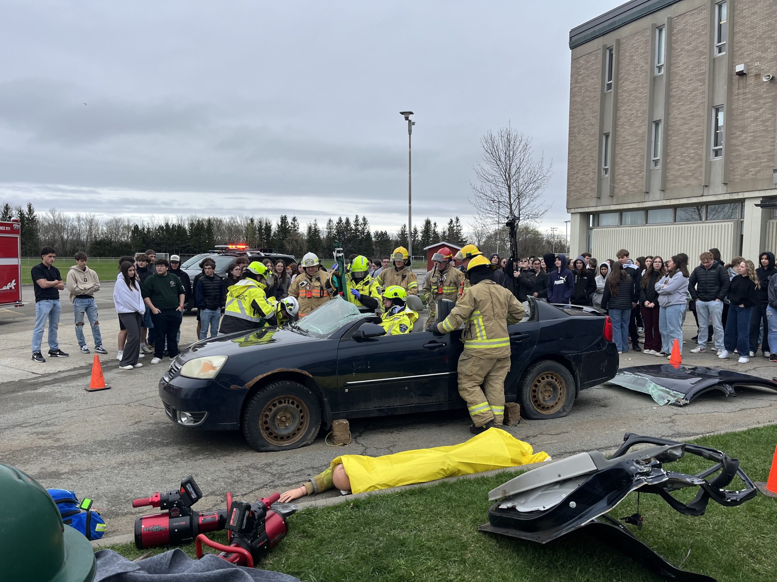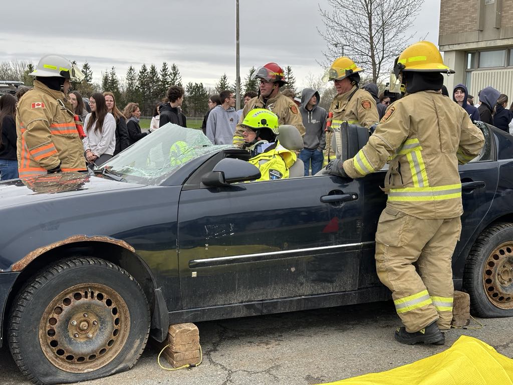 À la suite à ces témoignages, les jeunes ont pu observer à l’extérieur de l’école une intervention des services d’urgence dans une mise en scène impliquant une voiture accidentée et une fausse victime. Soulignons que la voiture a été offerte par le Garage Vincent Giasson.